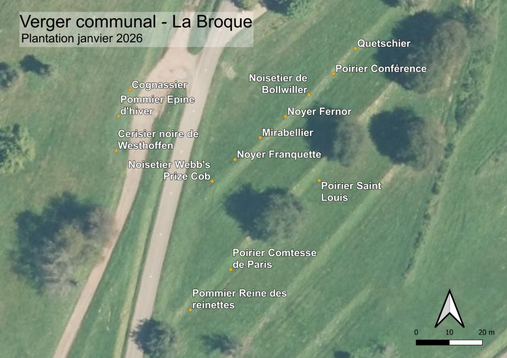 - 13 arbres fruitiers plantés: 3 pommiers, 2 poiriers, 1 mirabellier, 1 quetschier, 2 noyers, 2 noisetiers, 1 cognassier et 1 cerisier